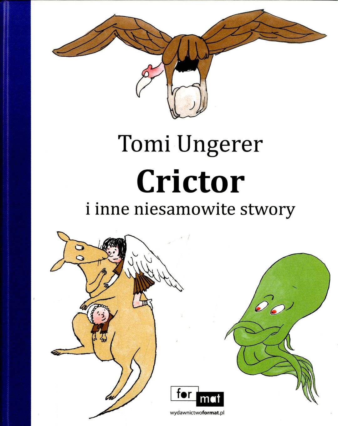 Zbiór opowiadań, które powstały w latach 60-tych. Autor poświęcił całą swą uwagę zwierzętom, których nikt wcześniej nie zauważył, a już na pewno nigdy nie umieścił w książkach dla dzieci. Wąż Crictor jest nie tylko pupilem swojej pani, ale także skutecznym poskramiaczem dzikich włamywaczy. Skrzydlata kangurzyca Adelajda wygląda jak modelka, ale bywa też śmiałym strażakiem. Ośmiornica Emil odnosi sukcesy nie tylko na scenie muzycznej, ale i na polu walki z przemytnikami. Kolorowy nietoperz Rufus uczy się czerpać radość z życia aż do Opowiadania powstały w latach 60., zaraz po bestsellerowych Przygodach rodziny Mellopsów. Tym razem Ungerer poświęcił całą swą uwagę zwierzętom, których nikt wcześniej nie zauważył, a już na pewno nigdy nie umieścił w książkach dla dzieci. Wąż Crictor jest nie tylko pupilem swojej pani, ale także skutecznym poskramiaczem dzikich włamywaczy. Skrzydlata kangurzyca Adelajda wygląda jak modelka, ale bywa też śmiałym strażakiem. Ośmiornica Emil odnosi sukcesy nie tylko na scenie muzycznej, ale i na polu walki z przemytnikami. Kolorowy nietoperz Rufus uczy się czerpać radość z życia aż do zawrotu głowy. I wreszcie sęp Orlando - ten nie dość, że z powodzeniem pełni funkcję gołębia pocztowego, to jeszcze potrafi przywracać szczęście w rodzinie. [www.empik.com]