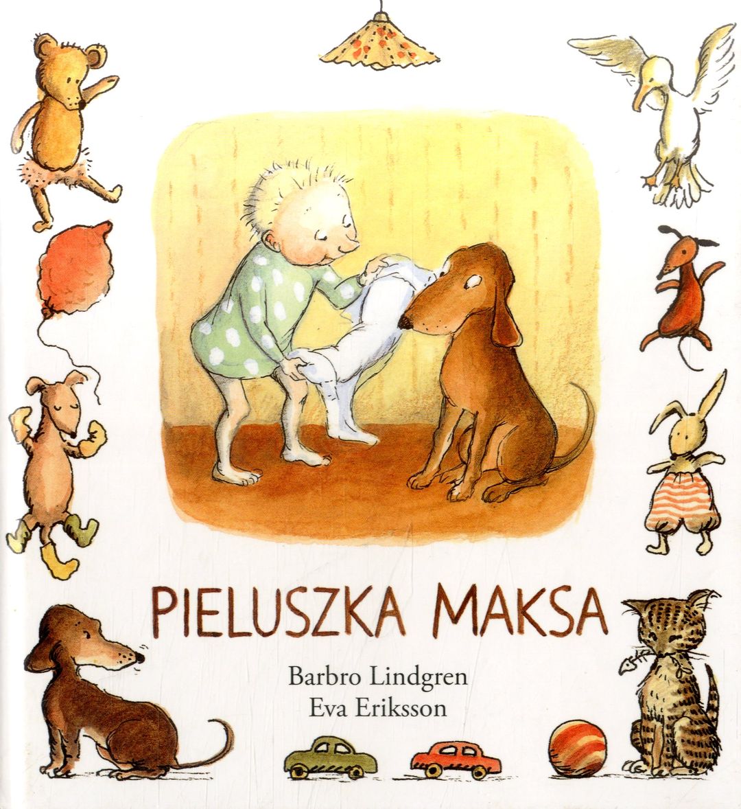 Maks ma pieluszkę. Na pupie. Ale nie ma to jak siusiać na podłogę! Za to piesek - bardzo chętnie posiusia w pieluszkę. Tylko co na to mama? Każda książeczka o Maksie to pełne dramatyzmu zdarzenie z życia małego chłopca. Towarzyszy mu piesek, który raz pomaga Maksowi wyjść z opresji, raz mu się psoci, a kiedy indziej broi razem z nim. W trudnych momentach pojawia się mama, która wie kiedy utulić, a kiedy skarcić. Maks ma swój charakterek - jak każde dziecko potrafi się złościć i dochodzić swoich racji. Pełne humoru i szelmowskiego uroku ilustracje Evy Eriksson spełniają warunek prostoty i przejrzystości koniecznej dla odbioru ich przez dziecko, a jednocześnie potrafią po mistrzowsku pokazać dziecięce uczucia i nastroje.
